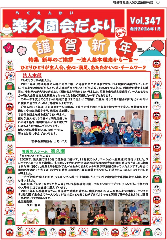 楽久園会は、皆さまに各施設での活動内容などをご紹介する、広報誌「楽久園会だより」を発行しております。表紙をクリックするとご覧いただけます!